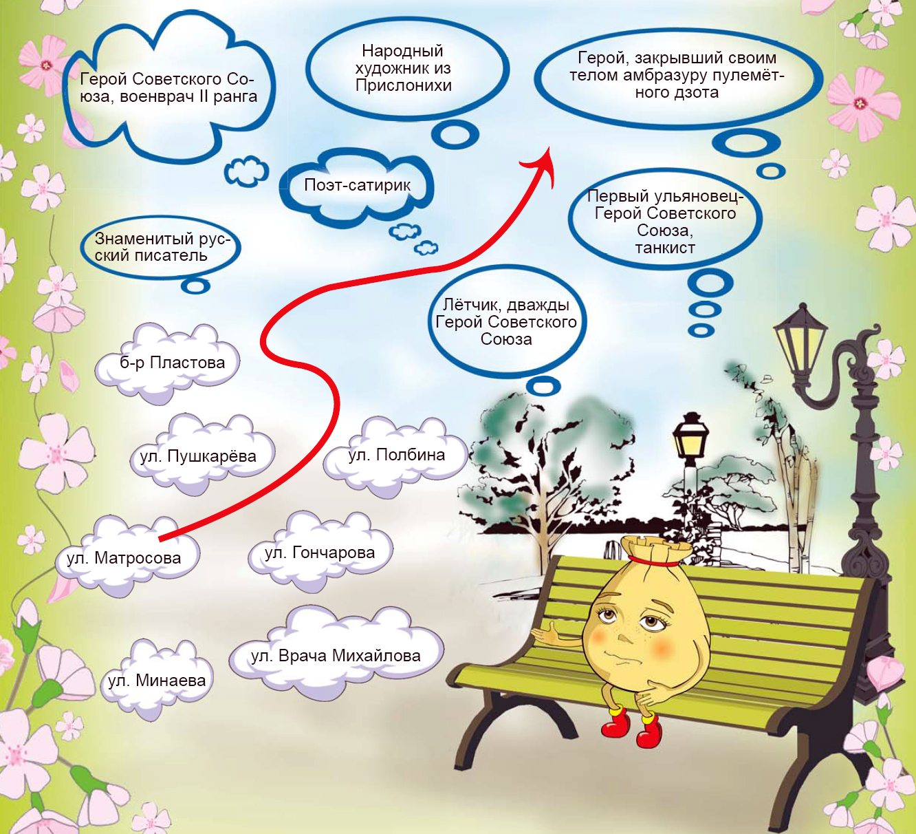 Однажды Симбик сидел на лавочке в Карамзинском сквере и думал: «А ведь многие улицы в нашем городе названы в честь наших выдающихся земляков. Попробую-ка я вспомнить, чем же они прославились!» Думал Симбик, думал, но так устал за день, что всё напутал. Ребята! Помогите Симбику разобраться. Если вы всё отгадаете, то будете настоящими знатоками нашего города!