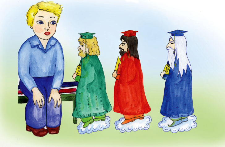 Гришке стало любопытно, и он не замедлил повторить слова стариков. Тут же в одно мгновение у него побелело в глазах. Очнувшись, Гришка с удивлением обнаружил, что мир вокруг него очень странный. Дороги похожи на прямые линии, дорожные знаки в виде «+», «–», «:» и «х», проезжающие машины напоминают цифры, а дома – геометрические фигуры.