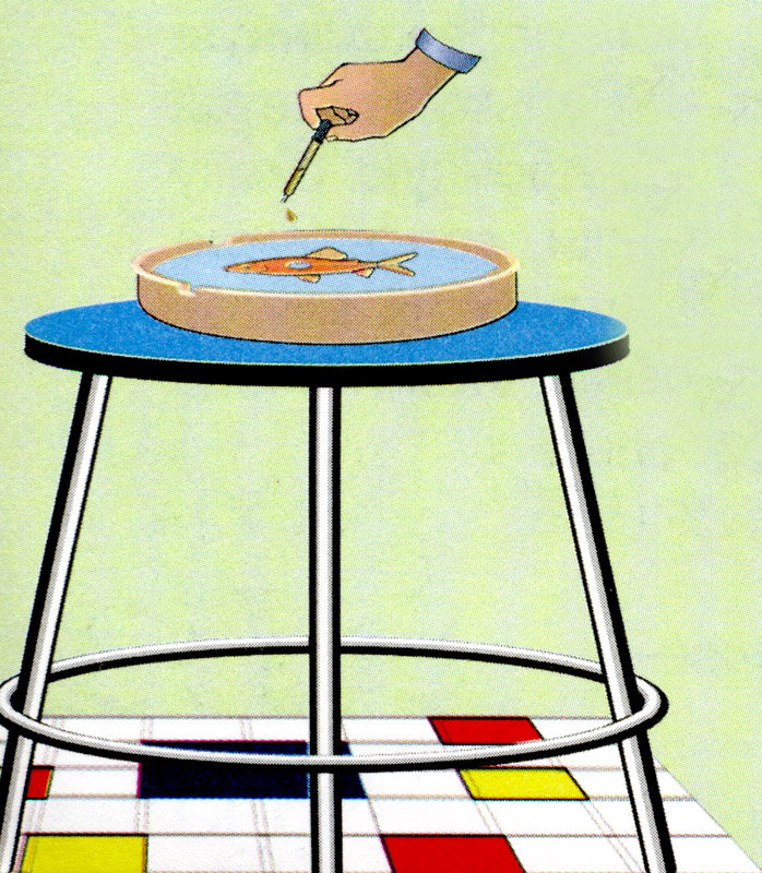 Вырежьте из бумаги рыбку. Опустите рыбку плашмя в таз с водой так, чтобы намоченной оказалась только её нижняя сторона. Скажите зрителям, что вам удастся оживить рыбку с помощью волшебного зелья. Возьмите пипетку и капните из неё большую каплю растительного масла в отверстие в рыбке. Рыбка поплывёт вперёд. Масло будет распространяться по поверхности воды и потечёт по желобку. Благодаря этому бумажная рыбка начнёт двигаться.